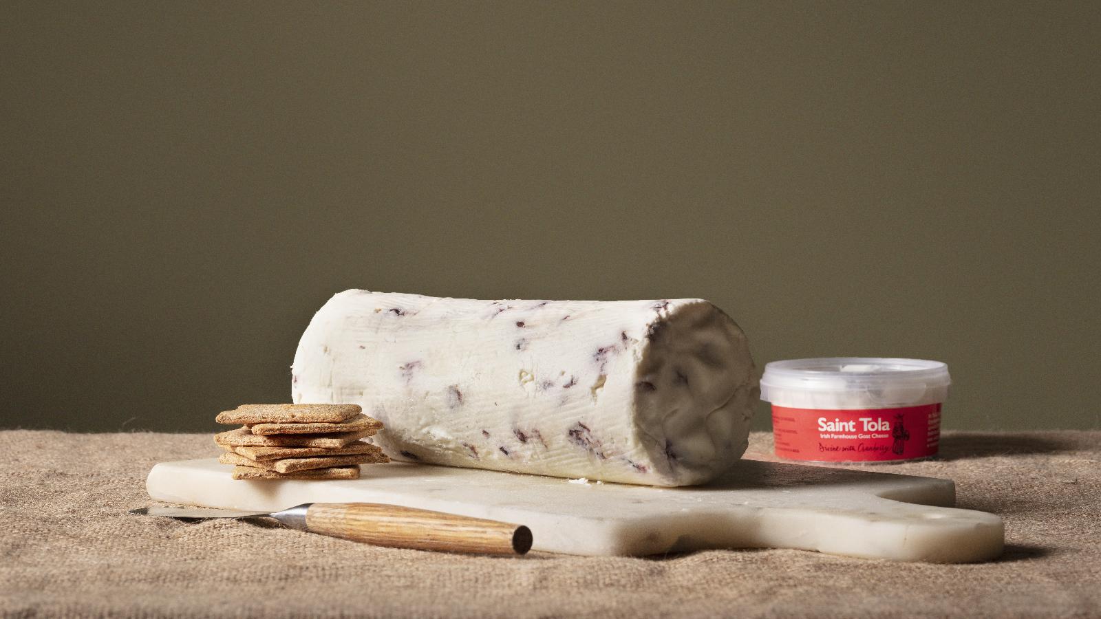 The sour/sweet flavour and pretty rose colour of cranberry work as a perfect foil to the lush creaminess and mellow honey flavours of St Tola. The soft cheese is made in the same way as the traditional logs but with cranberries added. It is traditionally very popular at Christmas time however St Tola Cranberry can be produced year round to order.